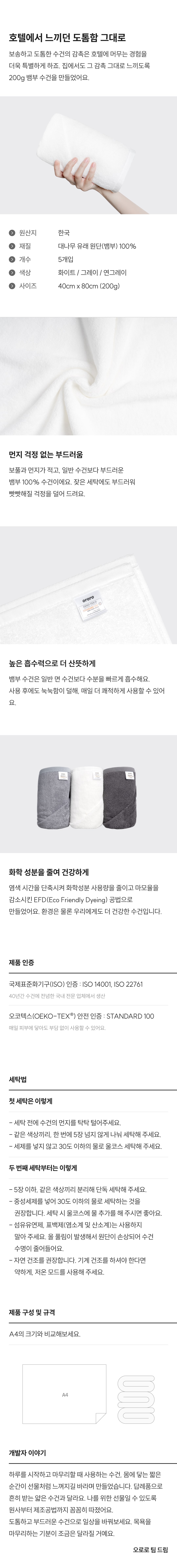 대나무 유래 원단으로 도톰하게 만든 200g 고중량 호텔 수건